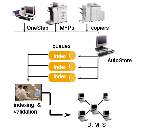 Documents from all sources — such as an MFD, digital copier, or fax server — can be routed to a queue defined by the Content Management Queue component for post-capture functions such as indexing and validation, document conversion, and document form recognition.
