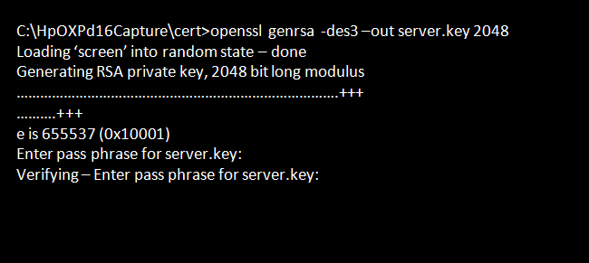 C:\HpOXPd16Capture\cert Enter the command: openssl genrsa -des3 -out