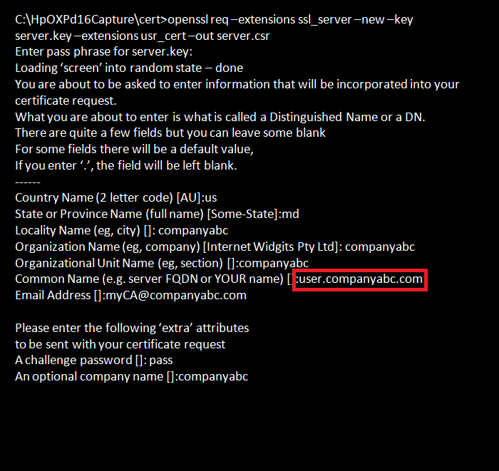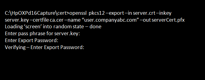 Create the server certificate request. Navigate to C:\HpOXPd16Capture\cert Enter the command: