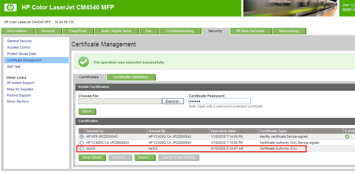Upload the CA certificate labeled “ca.cer” to the MFP using the EWS. Navigate to the Certificate Management page: On Jedi-based devices, it is under the Security tab. On OZ-based devices, it is on the Settings tab.