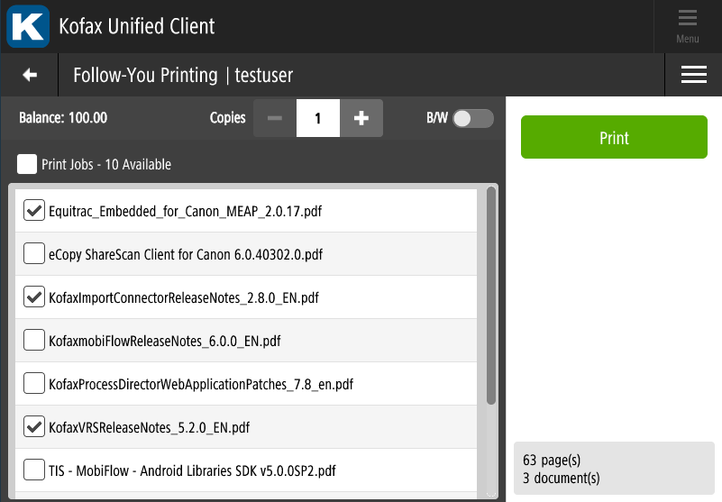 - The top line of the documents list indicates the number of documents available. To select all or clear all documents, press the check box next to Print Jobs.