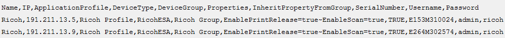 This topic provides guidelines for importing Combined Client for Ricoh device information into Device Registration Service with a comma separated values (CSV) file.