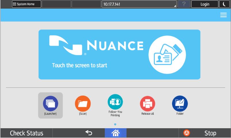 - Login button: Presents the login screen to authenticate and gain access to the Unified Client for Ricoh Smart Operation Panel .