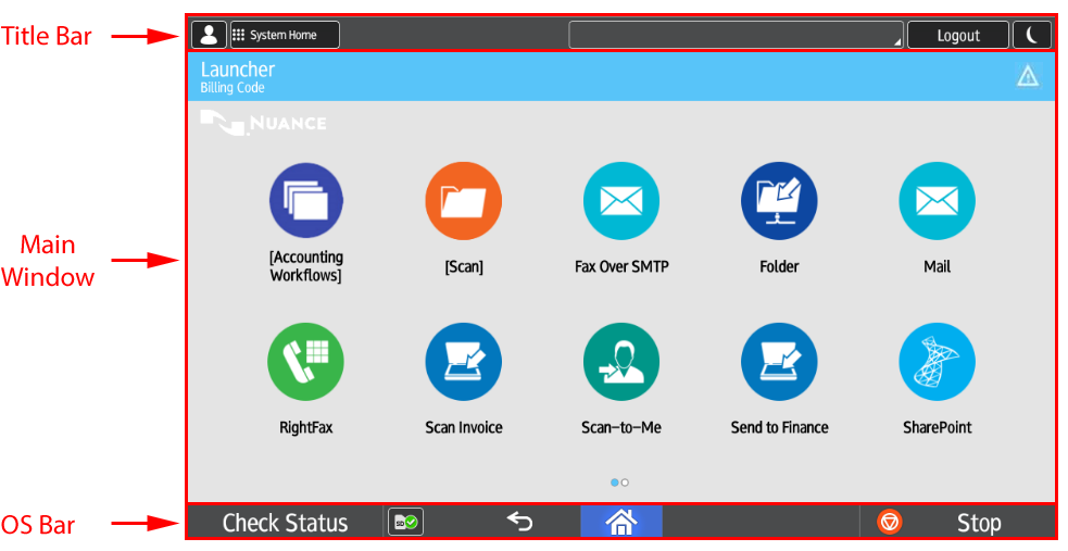 The Unified Client for Ricoh Smart Operation Panel user interface is touch-based. Use your finger or a pointing device such as a stylus to make common touchscreen type gestures, type on the soft keyboard, scroll lists of options, and perform certain system commands. Users can swipe the screen to reveal more options, as indicated by the carousel dots. The screen requires that minimal pressure be applied when navigating the system. The user interface for the Unified Client for Ricoh Smart Operation Panel is presented in three areas: