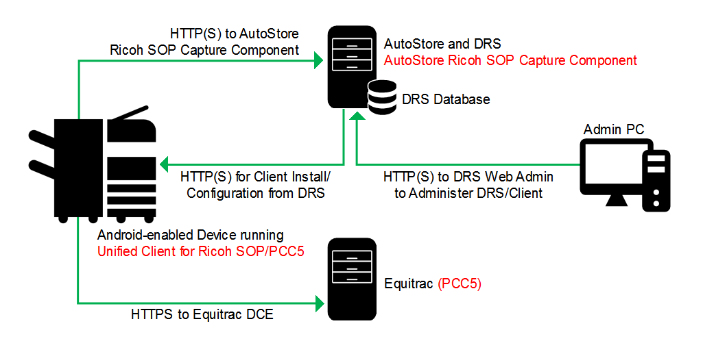 The following figure illustrates a typical architecture for a system that includes Ricoh PCC for AutoStore and Equitrac: