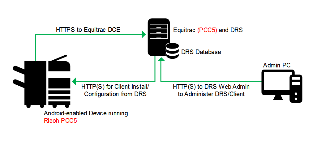 The following figure illustrates a typical architecture for a system that includes the Ricoh PCC for Equitrac: