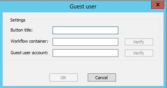 Before setting up a Guest user option, you must configure how you want the function to behave in Equitrac Office or Equitrac Express. The workflow that you assign to the Guest User function is configured in the same way as any workflow. Bear in mind what you want the button to do, and create a workflow to match that functionality. For instructions on creating workflows, see the Equitrac Office or Equitrac Express Administration Guide.