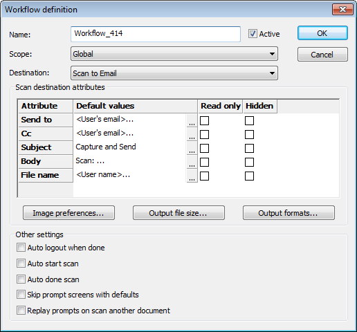 - Define the scan destination attributes by clicking the ellipsis button (...) beside the corresponding attribute’s default value in the Define attribute attribute-name default value dialog box and click OK.