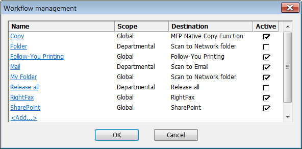 When the Workflow management dialog box first opens, a list of preconfigured workflows is displayed. Any of these can be edited to suit the scanning needs of the organization. Additionally, custom scan-related, system-managed and device-managed workflows can be created.