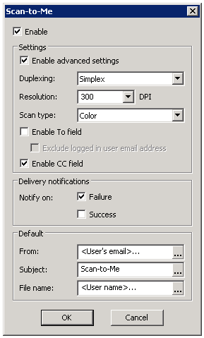 When enabled, adds the Cc field to the Scan-to-Me screen on the MFP, allowing users to enter one or more email addresses. The scan is sent to users in the Cc list, as well as to the user who performed the scan.