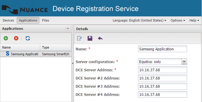 - From the Application drop-down list (required), select the application you created. In this example, Samsung Smart UX. The rest of the Add Device fields appear below.