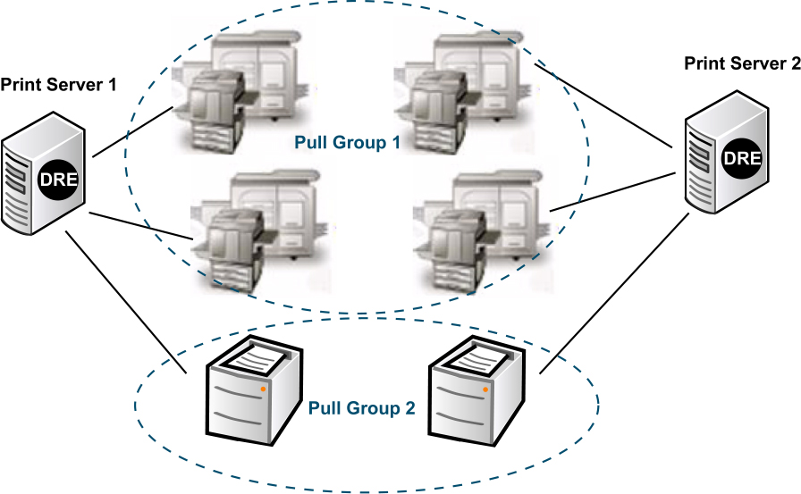You can create pull groups that include a selection of devices from a single print server only OR across multiple print servers.