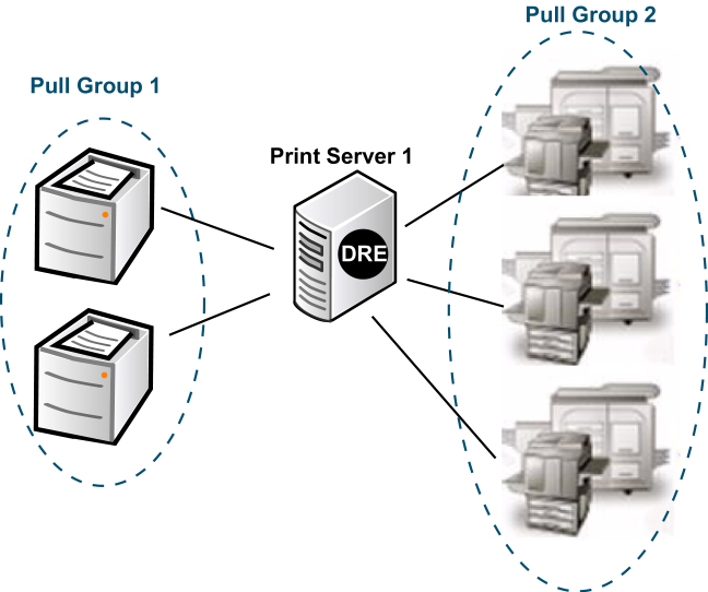 As you configure devices in System Manager, you can create and manage printer pull groups that group similar devices together. With secure printing enabled, users can release jobs from the pull group queue to any compatible device within the pull group. Pull groups are required to support Follow-You Printing.