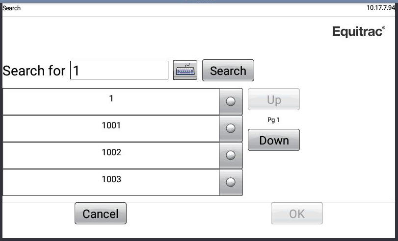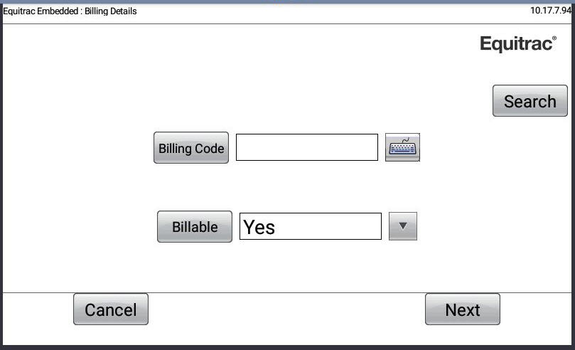 Search is a configurable option, and only appears on the screen when configured through Web System Manager. The Search button is active only when the Billing Code field is selected on the screen. The Search function is only available when embedded device is connected to the Equitrac server.