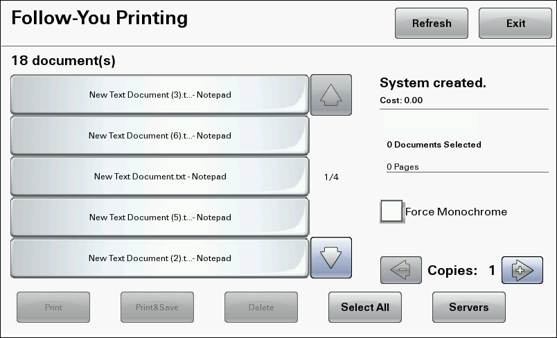 | Servers | If your configuration supports multi-server Follow-You Printing, you can select documents on other servers and pull them to this device to print. Press Servers to display a list of print servers. Select the new server and press Done to see a new list of documents. See Using multi-server Follow-You Printing. |