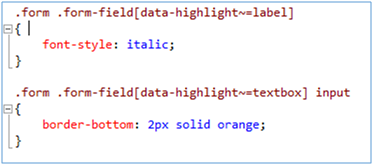 Expando attributes are assigned to the outer field container where they may be referenced and interpreted by client scripts or referenced through CSS; for example, Figure 2 illustrates how to highlight fields associated with the “highlight” XFP by italicizing the label and changing the color and size of the text box bottom border. The two CSS classes in Figure 2 utilize the tilde + equals sign which instructs the browser to match any part of the property value with the text following the sign.