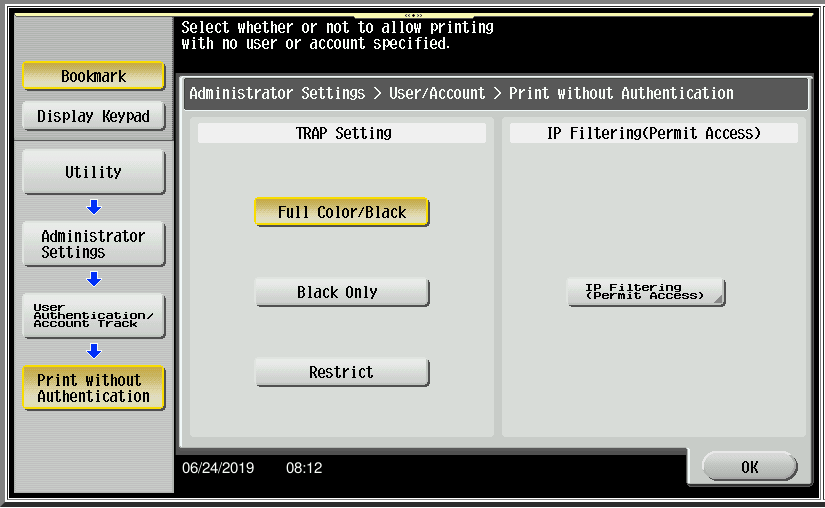 The Print without authentication option is used only when tracking print jobs through Equitrac ports. - Press OK to save the setting.
