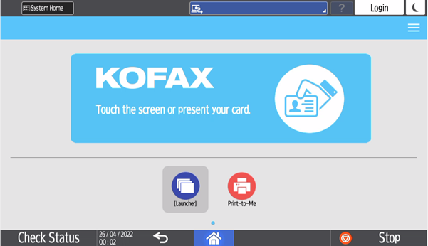 • Login button: Presents the login screen to authenticate and gain access to the Unified Client for Ricoh Smart Operation Panel .