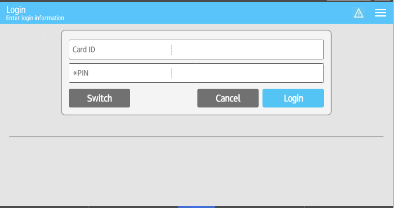 Manual ID entry login prompts for both ID or server or registers an unrecognized user. By default, the manual ID login provides fields for both card ID and PIN for logging onto the server. If the PIN option is disabled, the Unified Client for Ricoh Smart Operation Panel shows the login screen without the PIN field.
