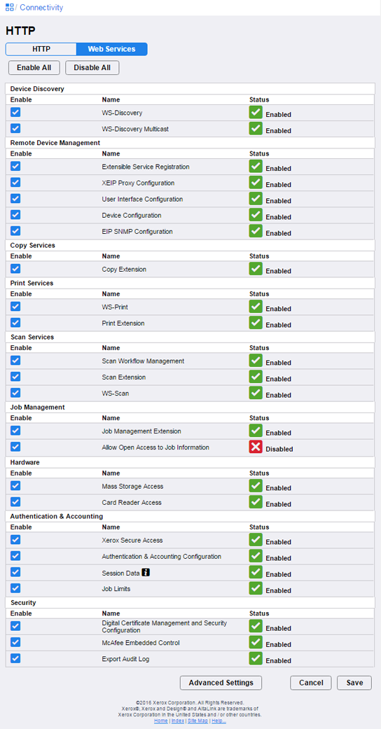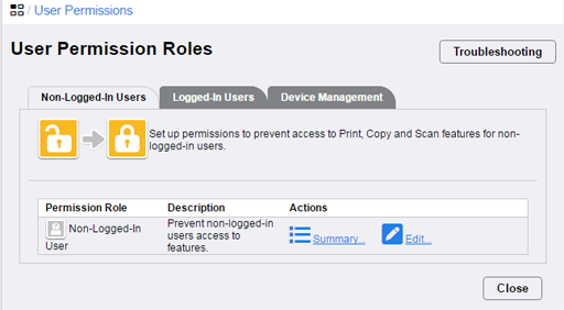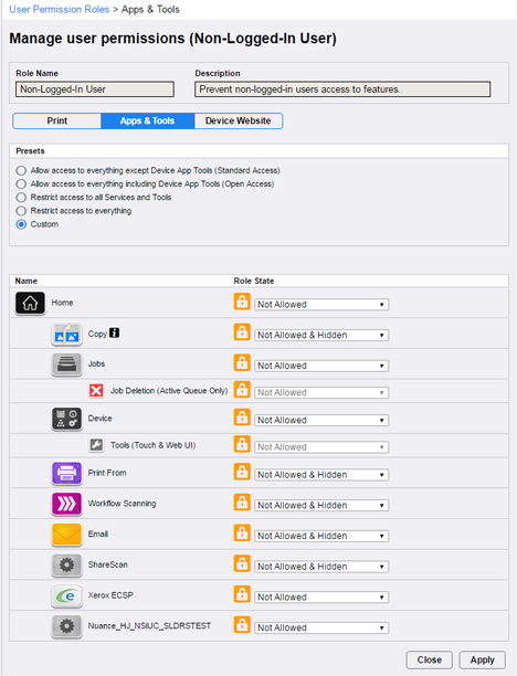 - Not Allowed & Hidden - the service appears on the MFP control panel, but cannot be accessed until the user authenticates.