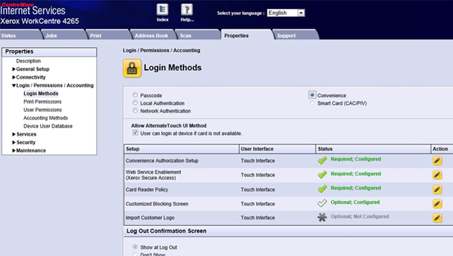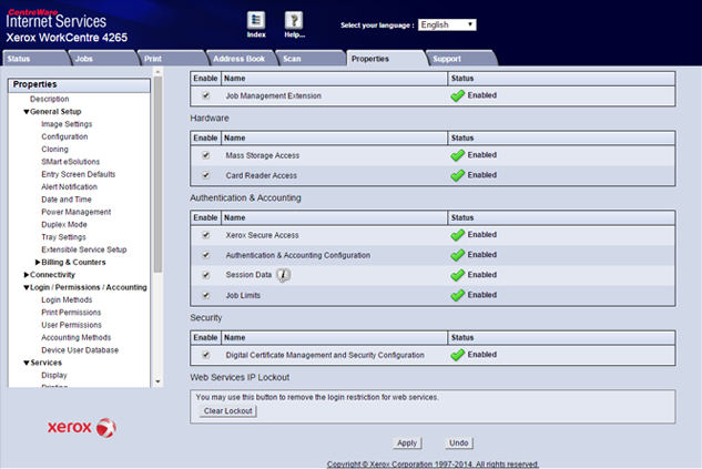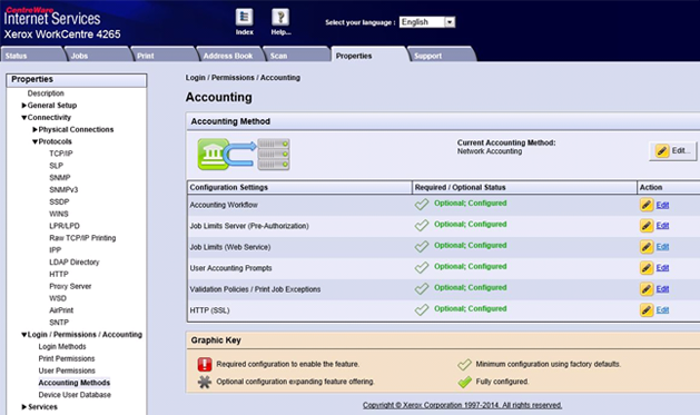 The Authentication & Accounting Configuration and Job Limits services must be enabled via the Internet Services interface.