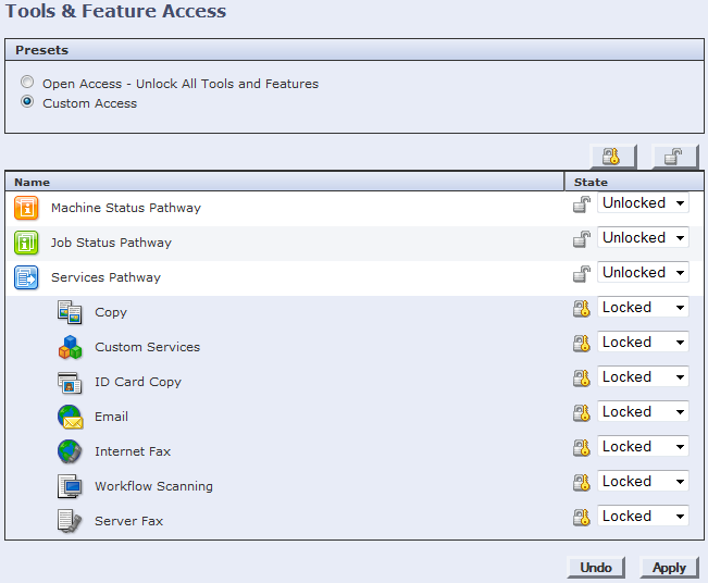 • Locked - the service appears on the MPF control panel, but cannot be accessed until the user authenticates.