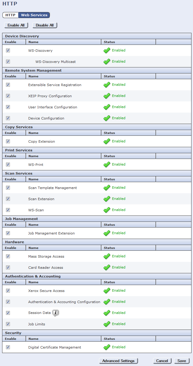 Ensure that both Authentication & Accounting Configuration and Job Limits are enabled. They are enabled by default. These services must be enabled via the Internet Services interface—not through the physical device. If these services are not enabled, errors occur when initializing the Xerox embedded device in System Manager, causing the Copy Stop feature to not work. Job Limits is not supported on all Xerox devices.