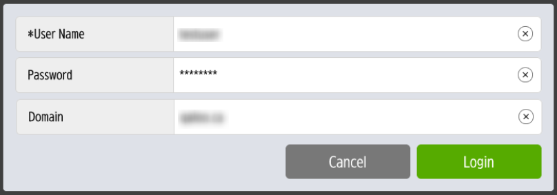 The user enters their credentials to log in to the AutoStore server in order to see the scan workflows they have access to. Pressing the Cancel button clears the prompts and if the user exits back to the main menu, the next user to start the Tungsten client sees cleared prompts.