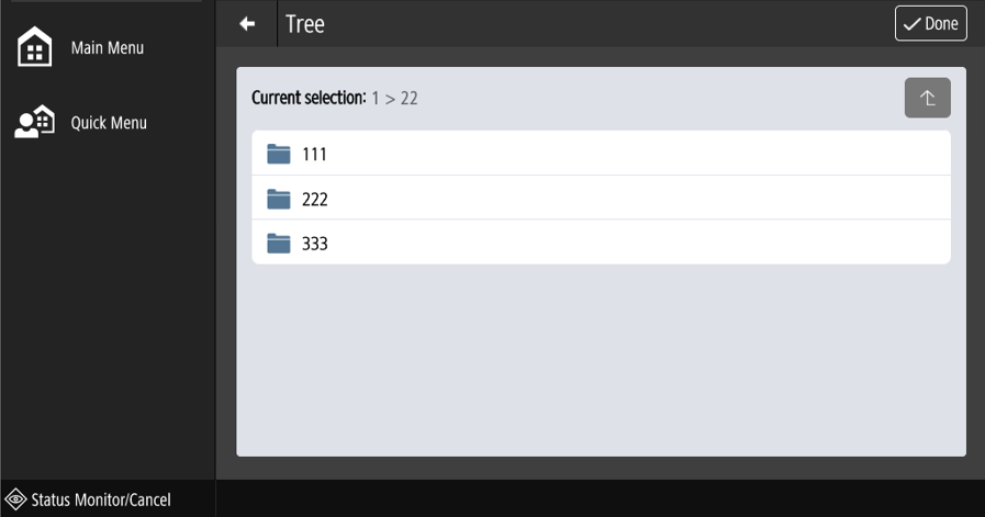 The tree field can be used for either navigating in a predefined tree or in a folder structure (the latter requiring server interaction while navigating). The path separator changes according to the type of tree. The selection is not modified until the tree window is dismissed by the Done button in the title bar. Leaving the window by using the left arrow acts as Cancel and does not alter the selection.