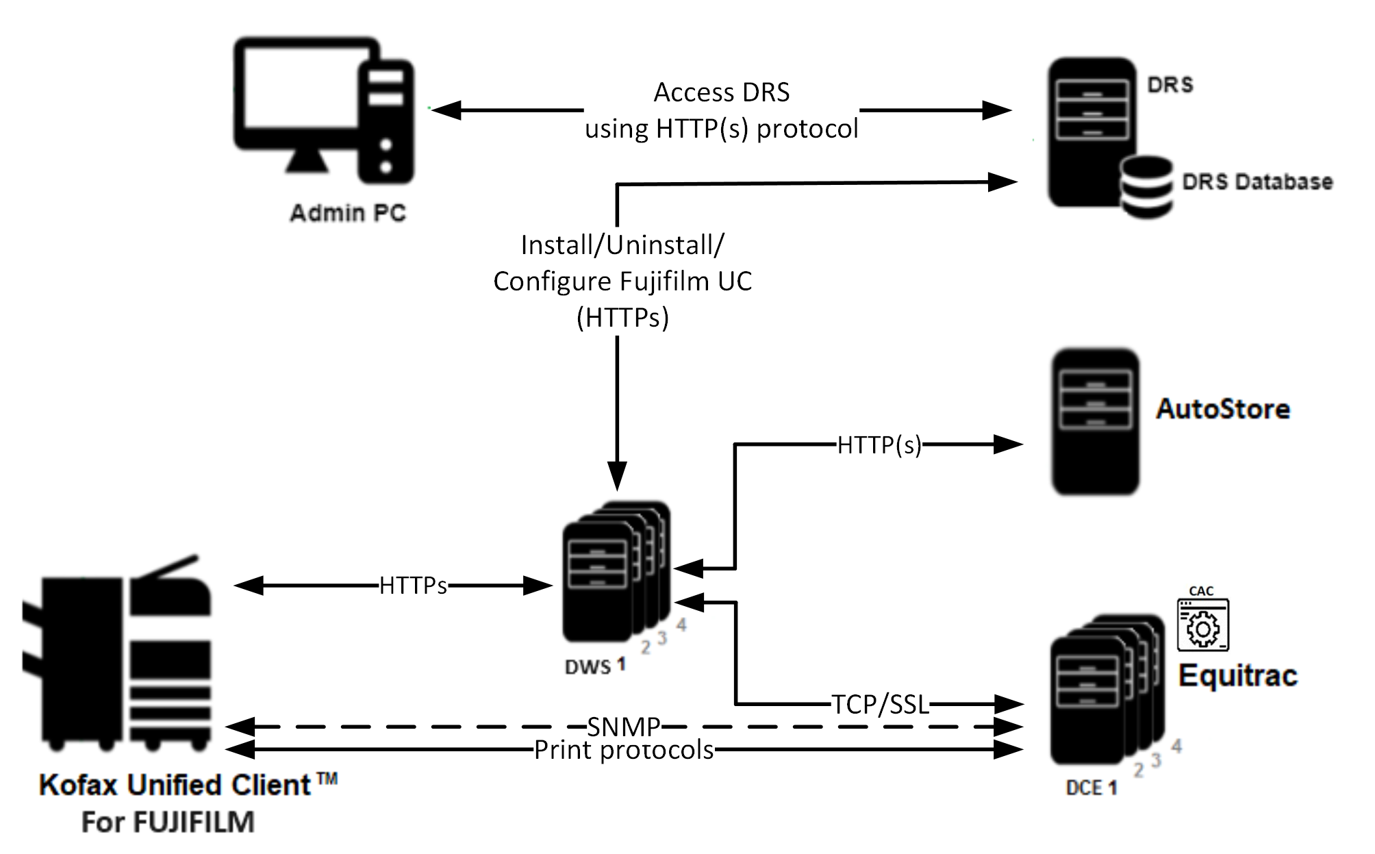 This figure illustrates a typical architecture for a system that includes the Unified Client for Fujifilm with Equitrac and AutoStore: