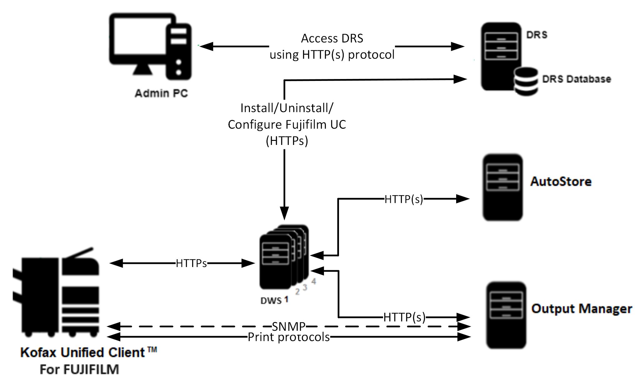 This figure illustrates a typical architecture for a system that includes the Unified Client for Fujifilm with Output Manager and AutoStore: