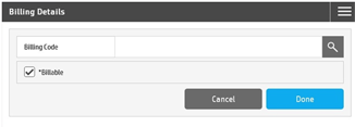 If the Billing Code validation is enabled, the billing code is validated when you select Done. If you searched for a code and selected it from the list, it is validated immediately. Billing code validation is set in Equitrac Web Client > System Configuration > Global Configuration Settings > User Interaction > Session Flow > Validate Billing Codes.