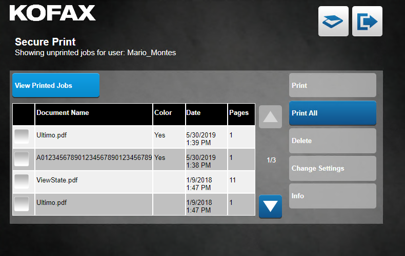 The Secure Print screen allows users to manage pending