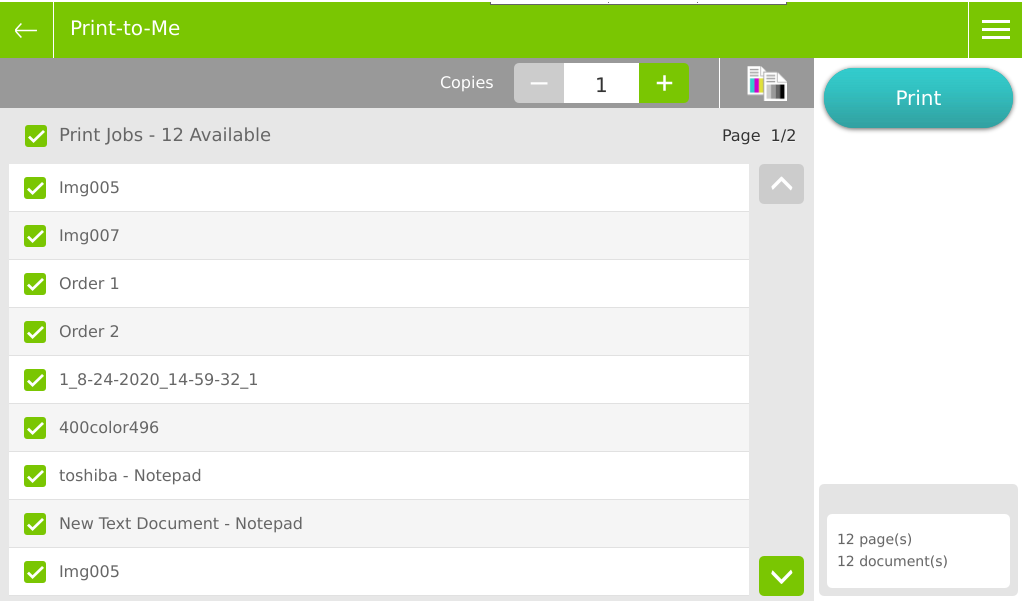- The top line of the documents list indicates the number of documents available. To select all or clear all documents, press the checkbox next to Print Jobs