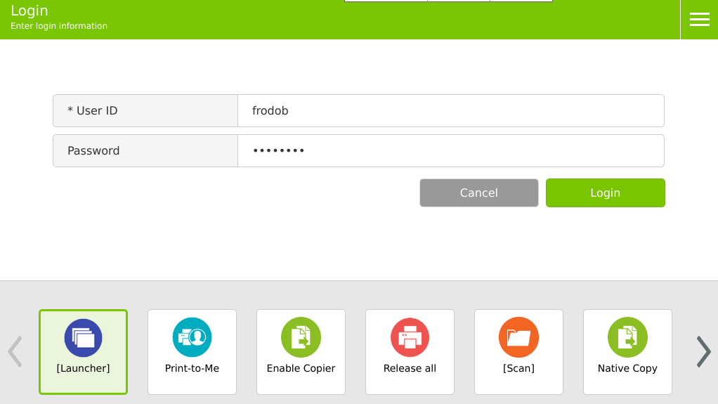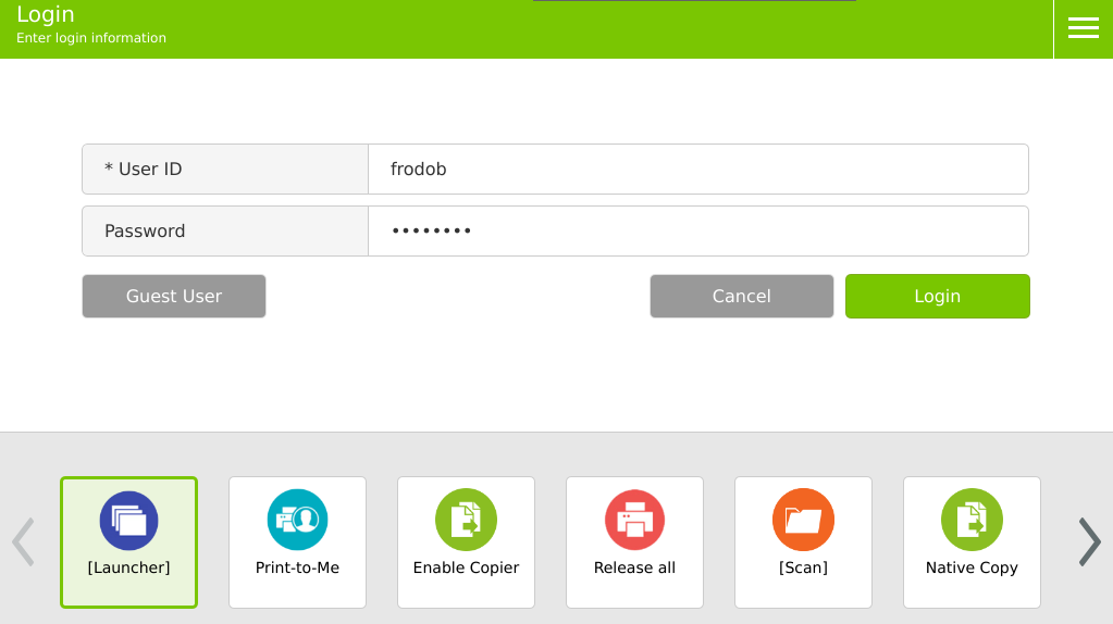 On this screen, users must provide valid user ID authentication credentials before they can access the device functions available to them. By swiping from the left side of the screen you can invoke Login As Guest option. For more information, see Set up the Guest user.