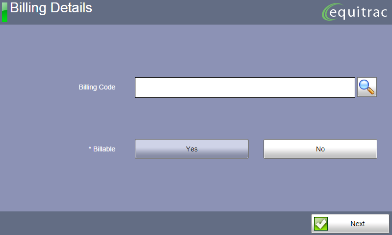 • A Billing Details prompt opens and the user must enter or search for a billing code (that can be billable or not) before proceeding to the Launcher screen.