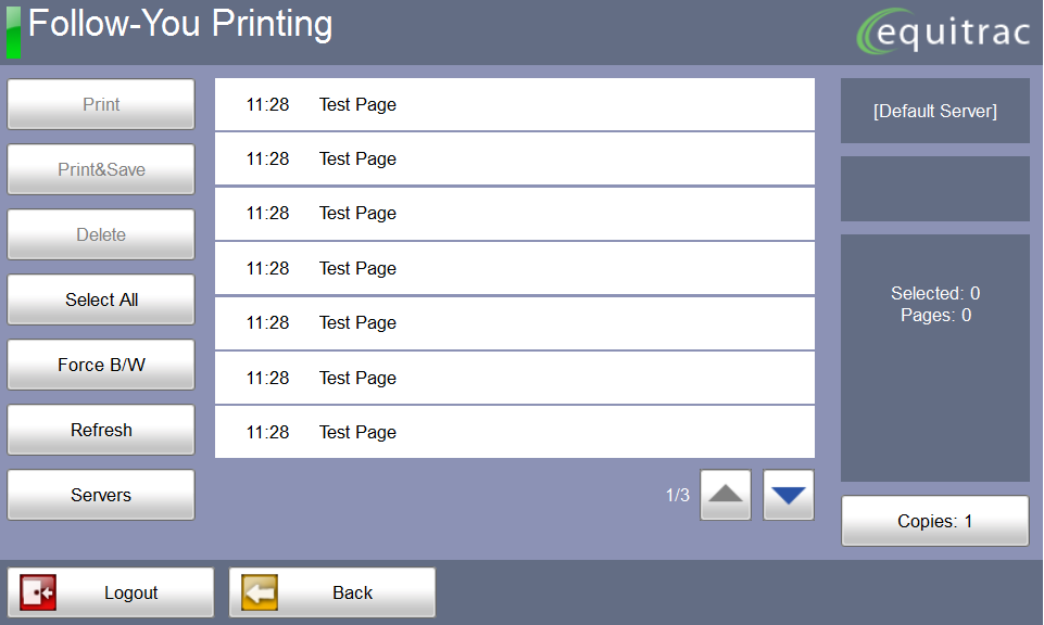 - Touch Print&Save to release any selected print job and save them in the Equitrac print queue.