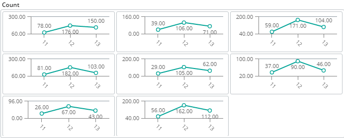 A Trellis chart is a layout of smaller charts in a grid with consistent scales. Each smaller chart represents an item in a category. The data displayed on each smaller chart is conditional on items in the category.