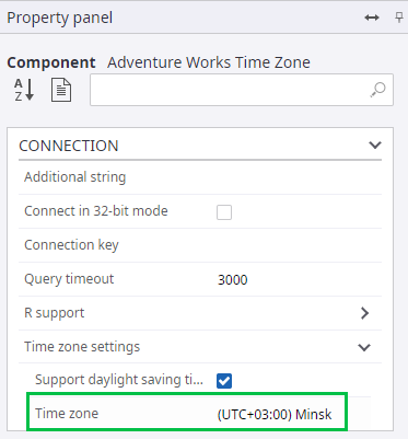In the Property panel, in the Connection group, select the UTC +03:00 Time zone from the list. This time zone will be applied by default to all time fields from this source.
