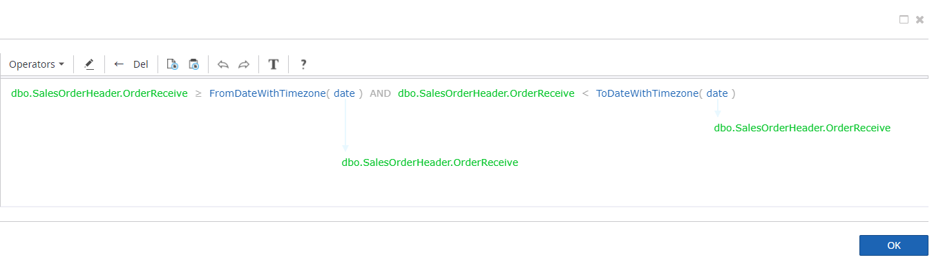 As the Insight server and the OrderReceive field time zones do not match, you need to edit the time filter, taking the time shift into account. Use the following parameters in the Time filter expression editor to filter data by time.