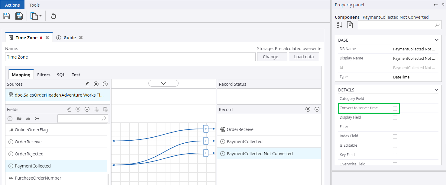 In the dbo.SalesOrderHeader table, select the PaymentCollected field and navigate to the Property panel. In the Other group, set Time zone mode to Custom and select the UTC Time zone.