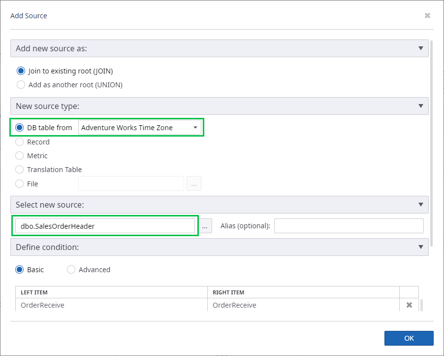 The data source time setting for the OrderReceive field is UTC +03:00.