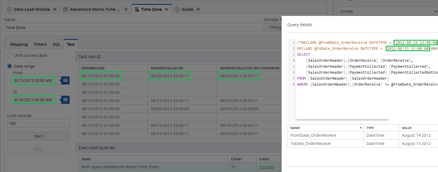 Insight server and data sources are often located in different time zones. Assume that Adventure Works stores data in the UTC +03:00 time zone. However, some fields are always written in GMT regardless of the database location. Assume that the dbo.SalesOrderHeader table has the following time settings for the fields.