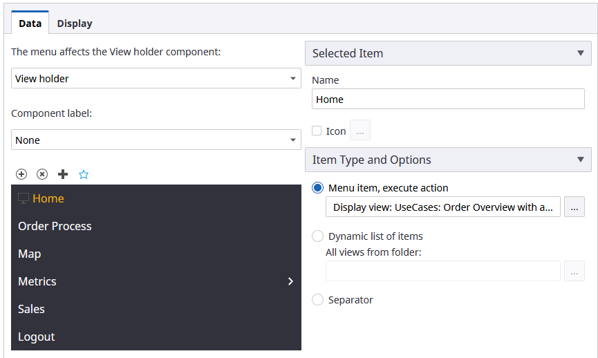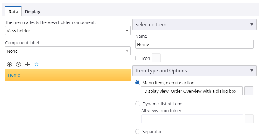 - Set the default View for the View holder component: click Add new data, highlight the new line, click the ellipsis icon, and select the Order Overview View from the Documents tree. Click OK.