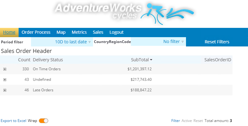 Horizontal menu, which changes the dashboards (Views) and includes different actions (logout, export to Excel, and more).