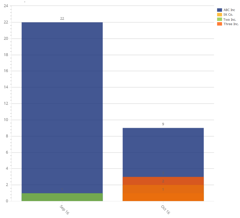 For example in the IDs Submitted dashboard, if you click on a point on the line graph, you may view the graph by Carrier. You can also view a specific area point on the line graph (drill down) by a different dimension. For example, see all the 24 IDs Submitted on Sep 2016 broken down by Carrier.