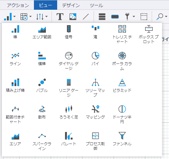 [ビュー] タブで、コンポーネント ツールバーにアクセスして、チャートやグリッドなどの新しいダッシュボード コンポーネントを作成できます。コンポーネントをクリックして、ツールバーから[ビュー]キャンバスにドラッグすることから始めます。コンポーネント ツールバーを使用して、チャート、グリッド、プロセス表示、ラベル、画像、線、メニュー、ボタン、フィルタ、ビュー ホルダー、または検索パネルを設計します。
