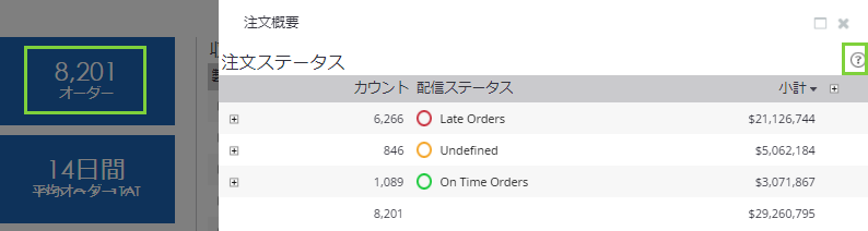 ボタンをクリックして、オーダー ターンアラウンド タイムでグルーピングされた遅い注文を表示します。ドリルダウンして、各注文の詳細を確認します。 |