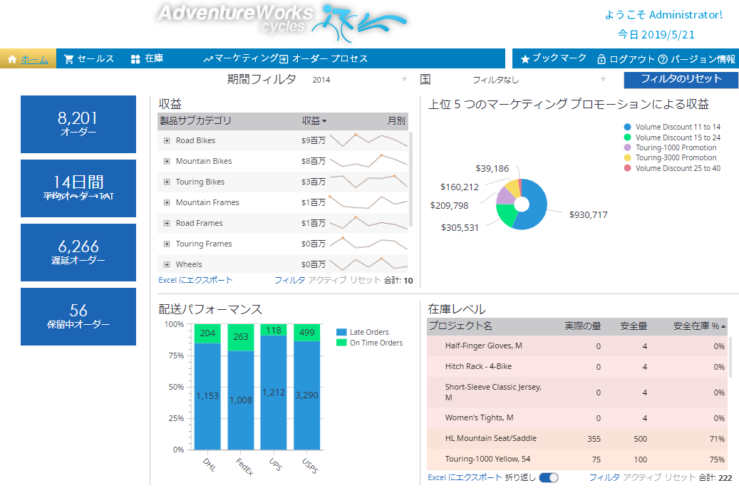 サンプル プロジェクト分析プロジェクトのランディング ページは、複数の Insight 機能を示しています。サンプルのランディング ページの要素は、デモンストレーションを目的としたものであり、文字どおりに解釈することはせきません。画面は、販売会社にとって重要な 4 つのグラフを表示しています。収益、トップ マーケティング プロモーション別収益、クーリエ パフォーマンス、在庫レベル。