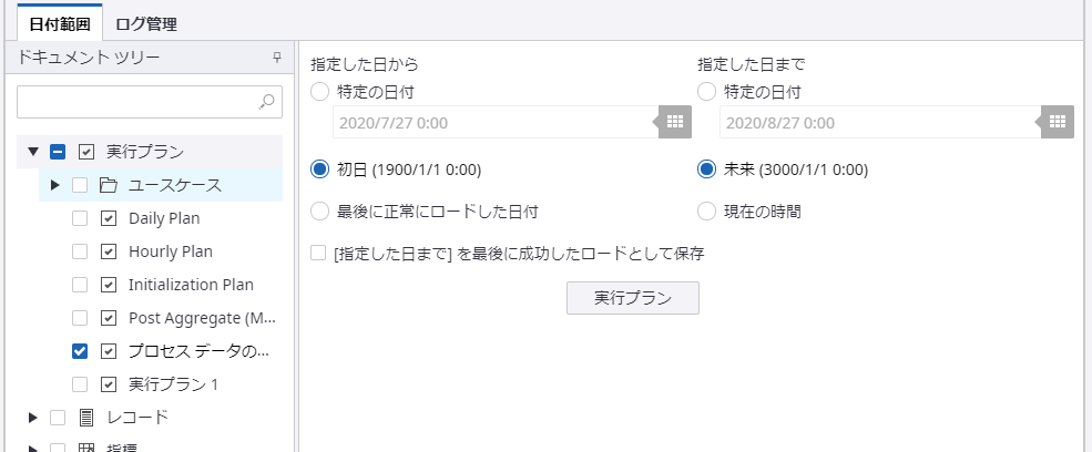 - [ドキュメント ツリー] で、[実行プラン] を右クリックし、[新しい実行プラン] を選択します。プロセス データのロードと名前を付けて[OK] をクリックします。